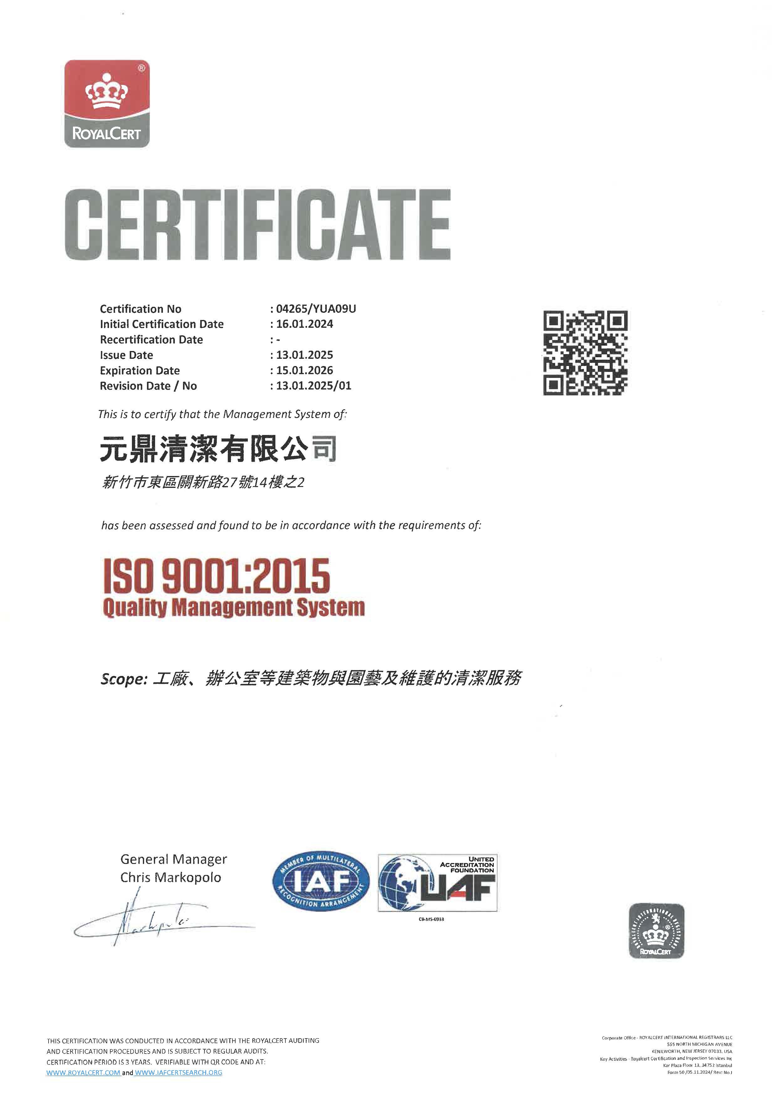 本著誠信、熱誠、專業與追求效率之理念服務客戶,期使顧客能享有更舒適、潔淨的廠房與辦公環境。顧客第一是本公司多年來始終如一的承諾。員工福祉及安全亦是本公司的重要責任及目標。